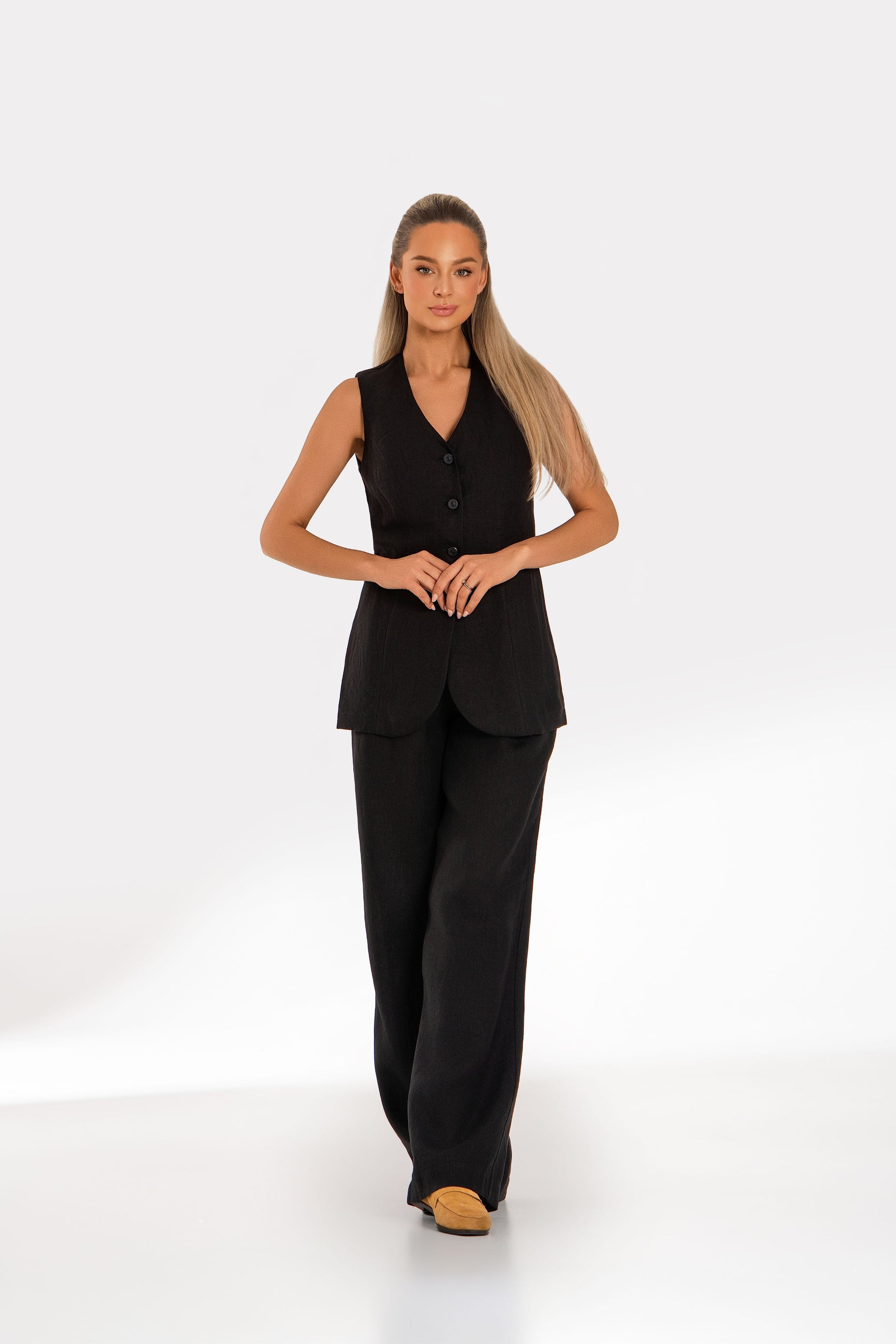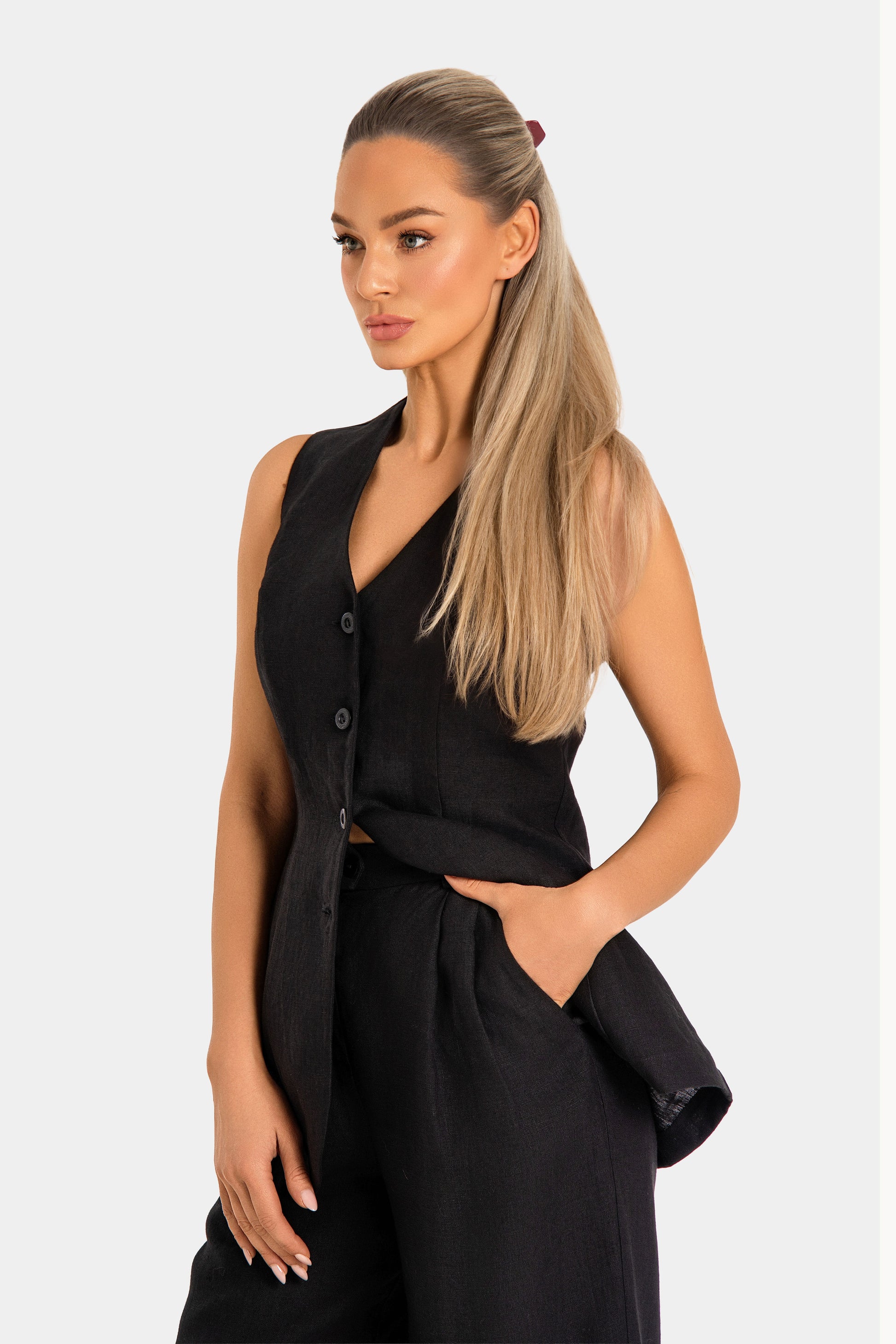 Nesenstančio silueto, pasiūta iš kvėpuojančio lino, ši berankovė palaidinė sujungia eleganciją ir struktūrą. Puikiai tinka dėvėti tiek sluoksniuojant, tiek kaip atskirą drabužį, suteikiantį bet kokiai aprangai žvilgesio.