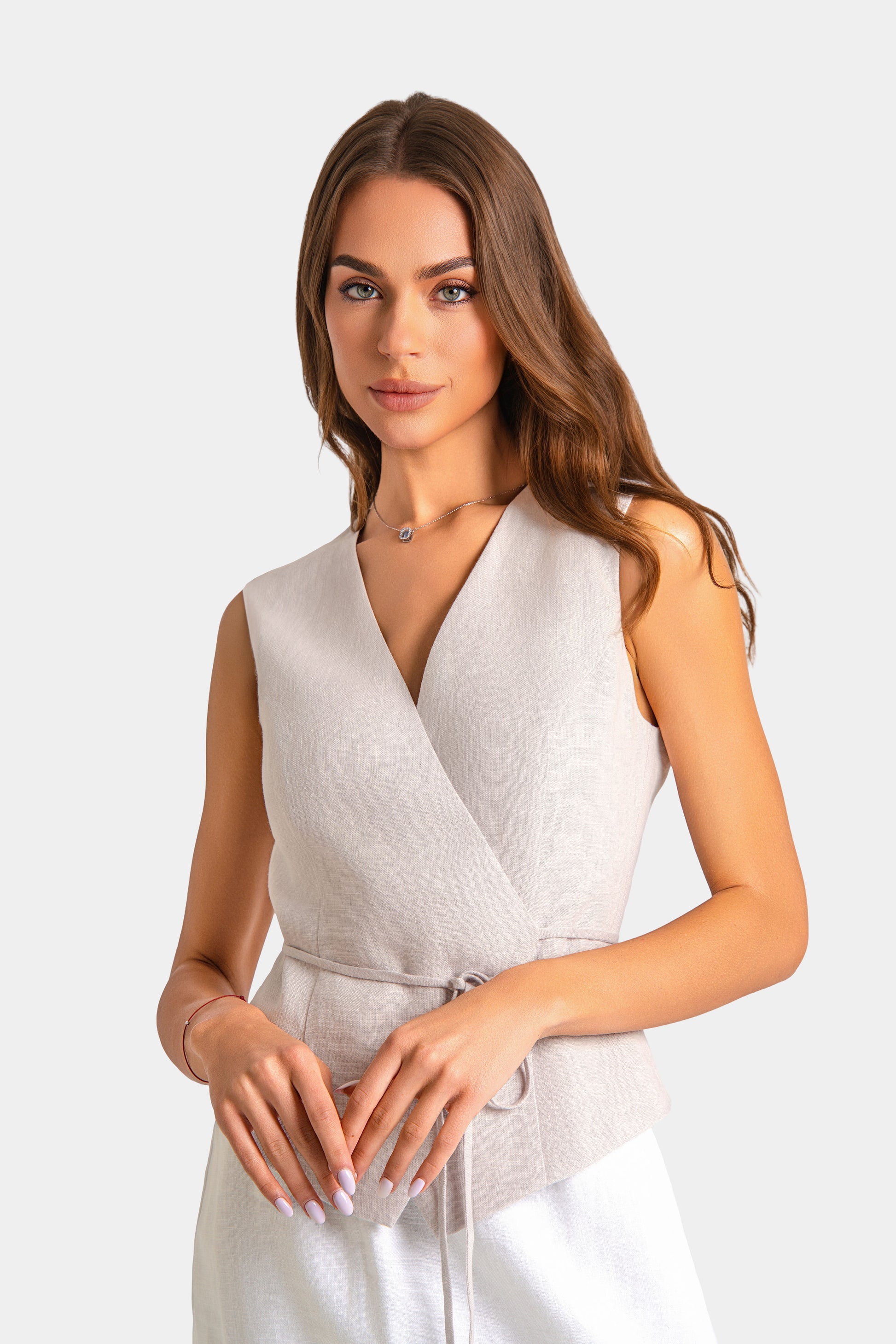 Prigludusi, tačiau lengvai prižiūrima „ Ivy Wrap Top“ palaidinė – tai struktūra ir minkštumas. Pagaminta iš kvėpuojančio 100 % lino, ši berankovė palaidinė pasižymi dailia V formos iškirpte ir apgaubiamu priekiu, surišamu ties juosmeniu, kad būtų reguliuojamas, figūrą paryškinantis prigludimas.