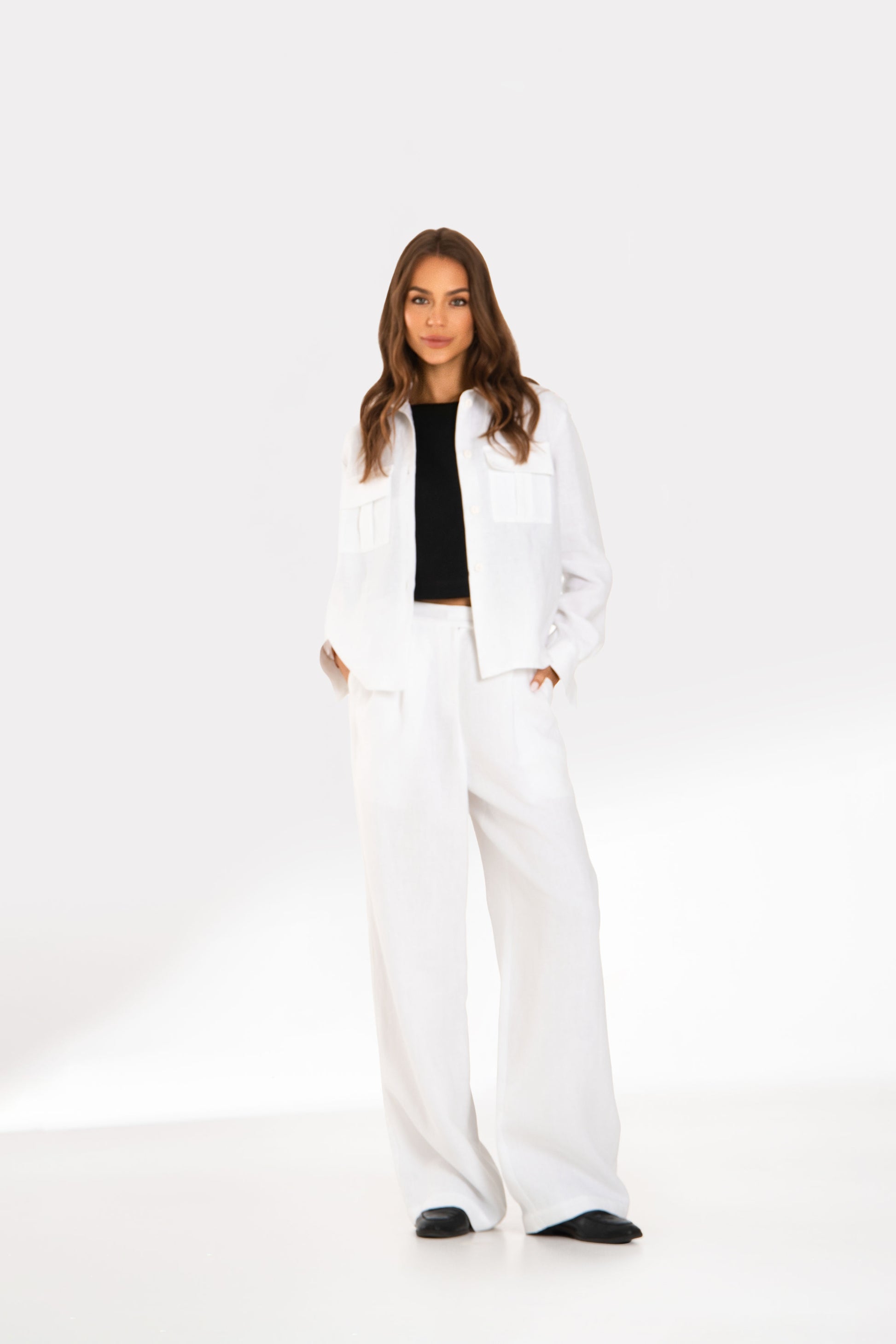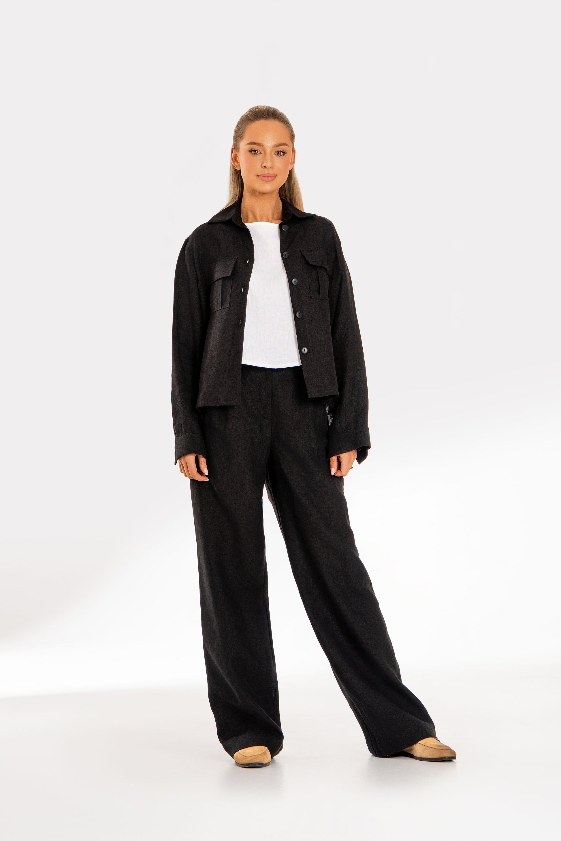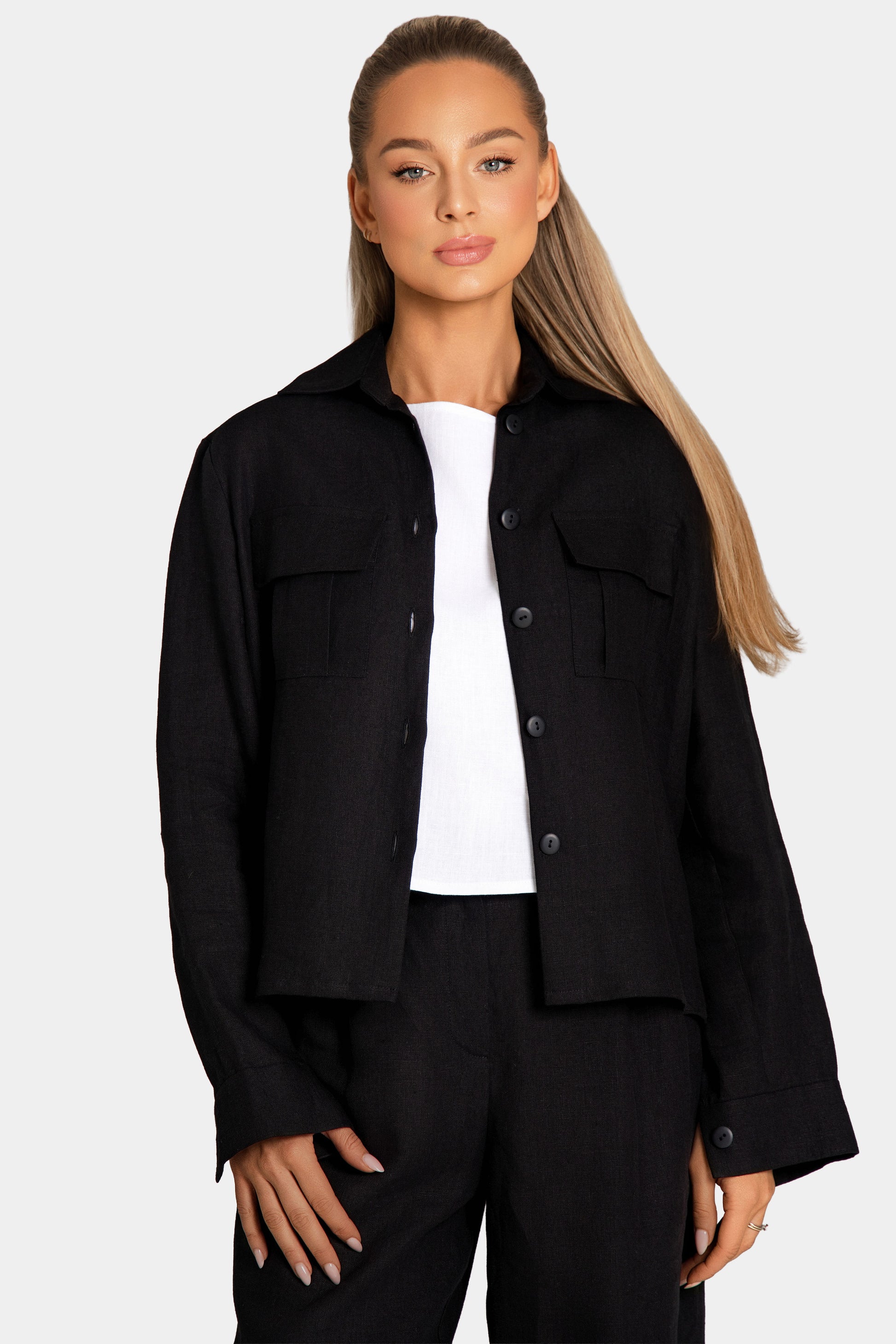 Minimalistiniai ir struktūriški – šie trumpi juodi lininiai marškiniai yra modernus būtinas drabužis. Sukurti siekiant suderinti patogumą ir rafinuotumą, tai puikus drabužis, kuris be vargo pagyvins bet kokį įvaizdį.