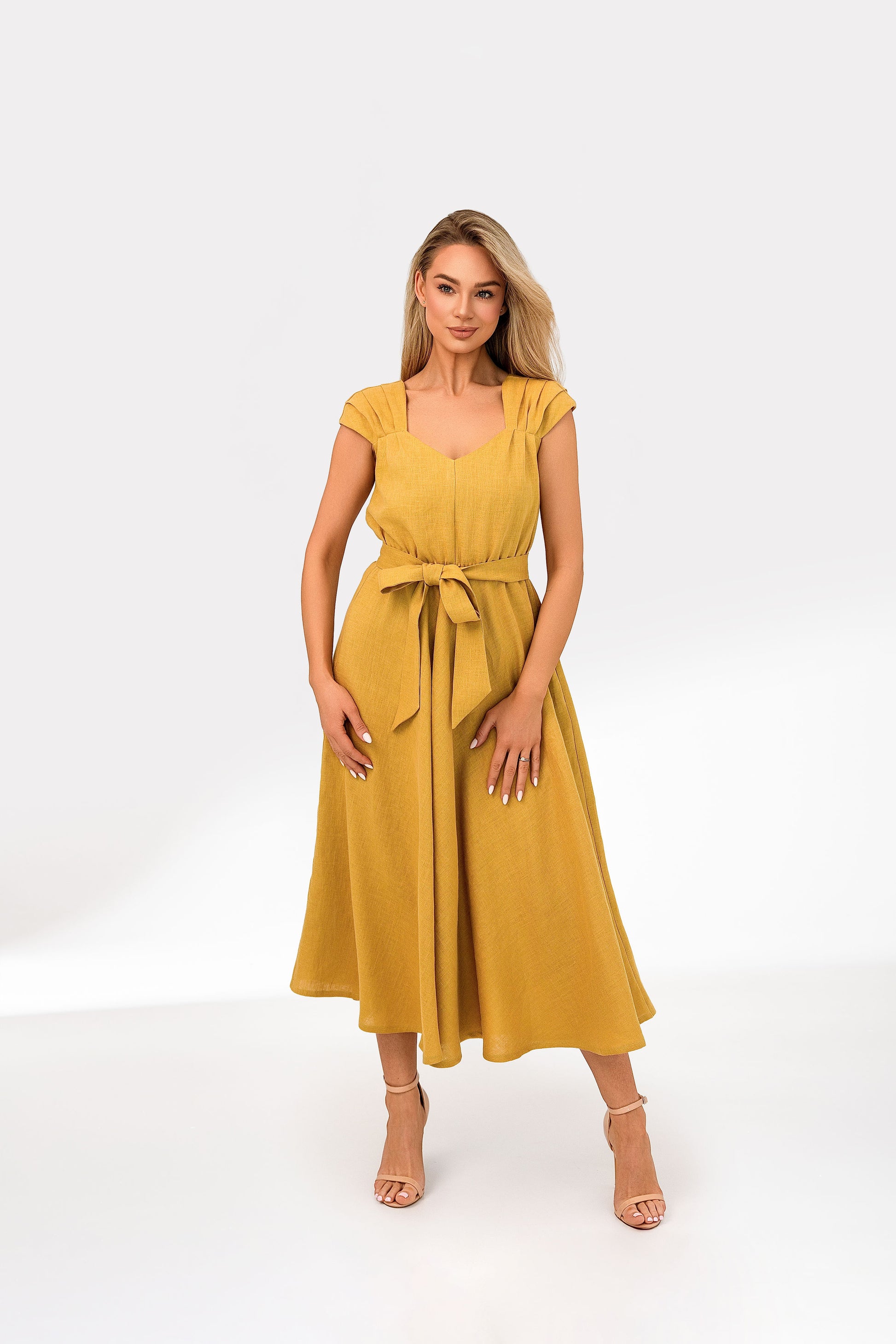 Pakelkite savo kasdienę eleganciją į kitą lygį su šia nepaprastai prašmatnia garstyčių geltonumo midi suknele. Pasiūta iš lengvo, kvėpuojančio audinio.